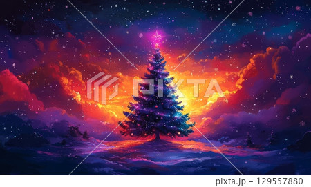 Enchanted christmas tree in vivid sunset winter wonderland for holiday magic