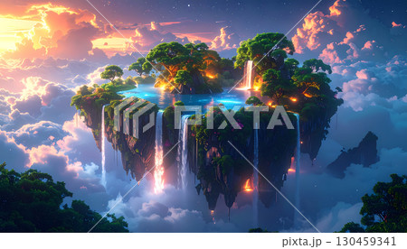 Serene magical fantasy landscape floating island in sky with waterfall cloud and sunset light creating dreamlike paradise for adventure
