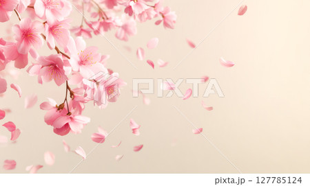 Delicate cherry blossom branches adorned with soft pink flowers and falling petals against a gentle gradient background, evoking springtime beauty and tranquility