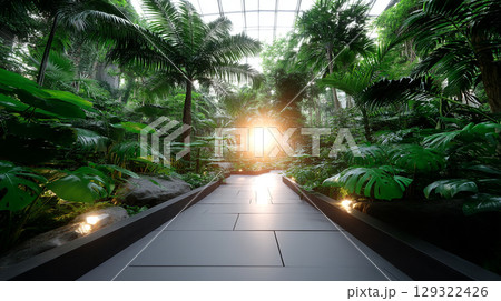 serene tropical forest path illuminated by sunlight filtering through lush greenery creates tranquil atmosphere, inviting meditation and reflection amidst nature beauty