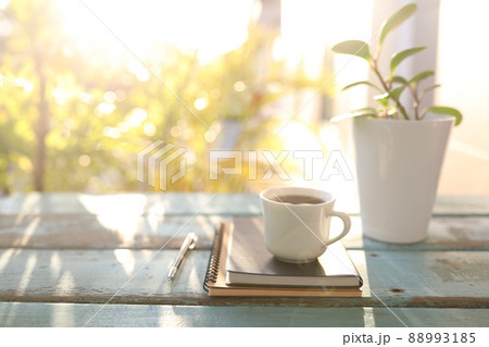 white cup with notebooks and pencil with plant pot on wooden table outside green exterior house