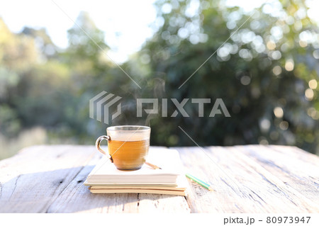 White coffee cup and notebooks with flowers on brown wooden table at outdoor lush scenery