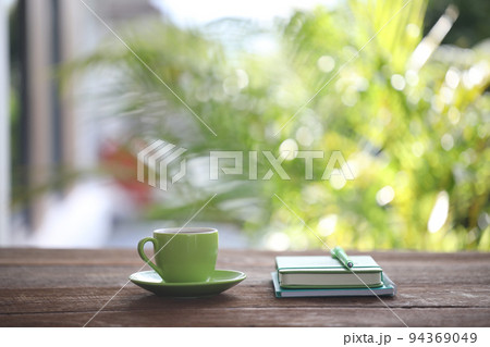 Green coffee cup and notebook, and pen on wooden table outdoor
