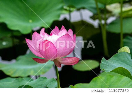 Green lotus leaf with pink lotus flower in a natural canal, Thailand.