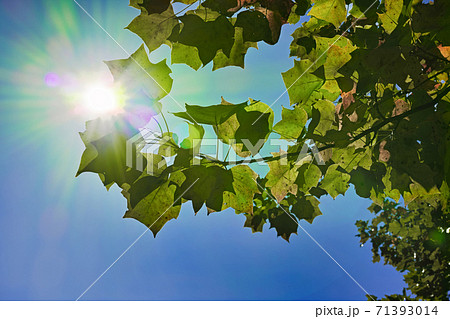 逆光の紅葉し始めたユリノキの枝葉と青空 横長