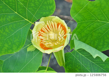 黄色とオレンジ色のユリノキの花(春、五月)