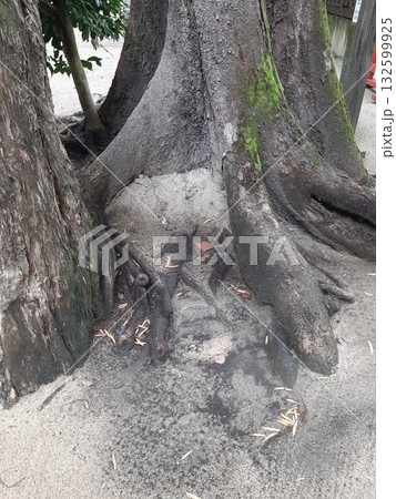 Close up of the roots of a tree in a tropical rainforest. Blurred nature background.