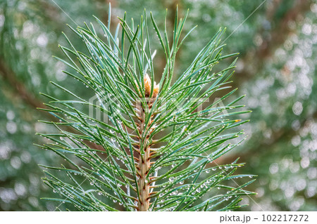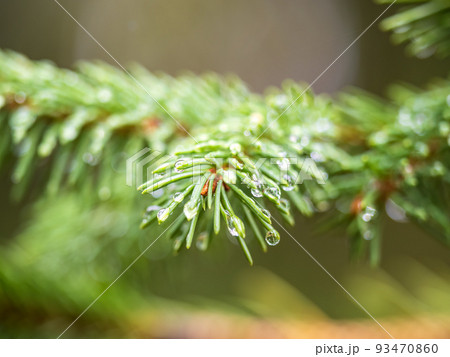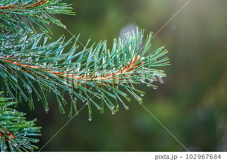 Background of green pine branches with water drops after rain