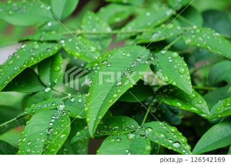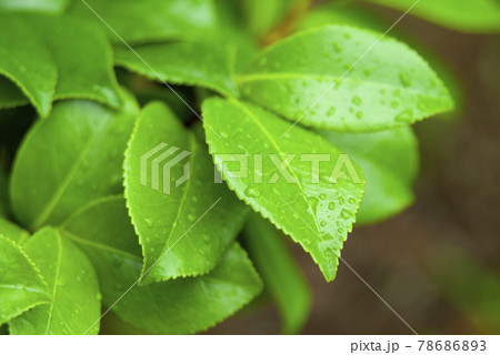 雨の日の雨粒のついた鮮やかな緑の葉