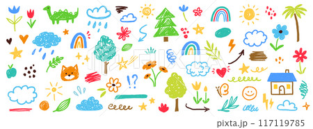 Kid crayon chalk line cloud, flower children element set. Hand drawn crayon doodle sketch childish element set. Chalk heart, cloud, flower color cute design element background. Vector