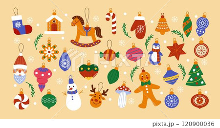 Bauble Christmas tree. Merry Xmas fir decor. Toy figurines. Santa ball. Bell or kids horse. Animal shape. Cute vintage festive decoration of glass. Celebration retro elements. Vector tidy New Year set