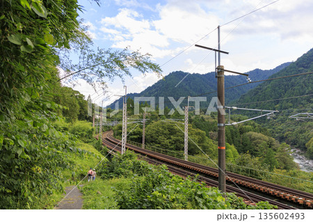長野県 寝覚めの床へ続く山間の鉄道と緑豊かな秋の風景
