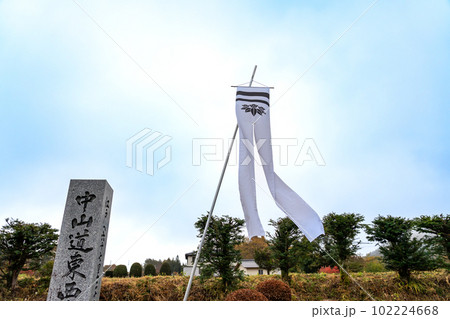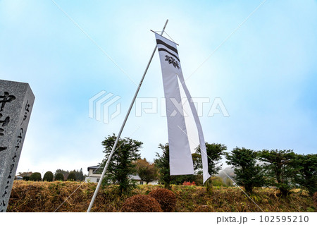 長野県木曽町 道の駅日義木曽駒高原にある木曽義仲旗揚げの地のイメージの旗と石標
