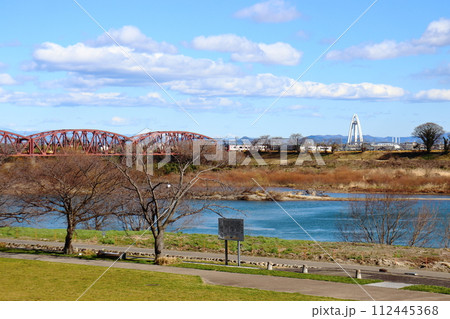 木曽川と名鉄名古屋本線の鉄橋とツインアーチ138(笠松みなと公園)