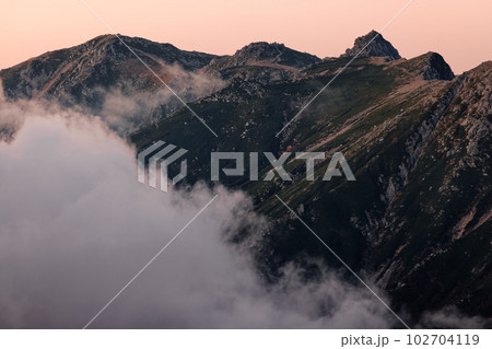 熊沢岳から見る夜明けの中央アルプス主稜線