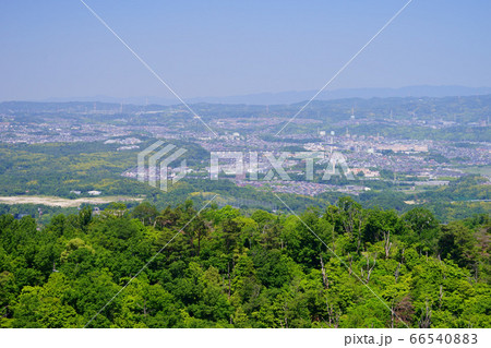 京都府最南端木津川市城山台城跡からの夕景 山麓を照らす夕日と夕焼け雲