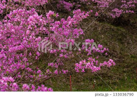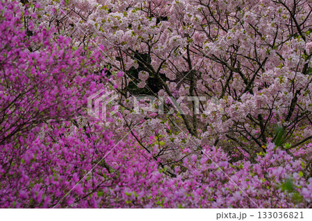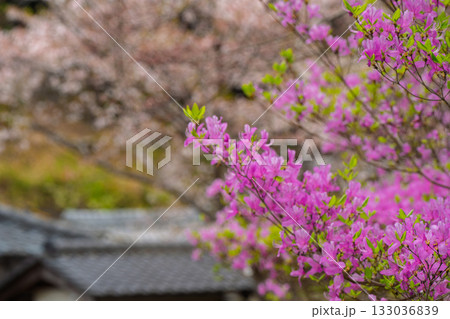 ミツバツツジが咲き乱れ山がピンク色に染まった春色の木津川市神童寺境内を撮影
