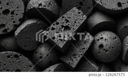 A photorealistic close-up image showcasing the detailed texture of activated carbon granules. Generative AI