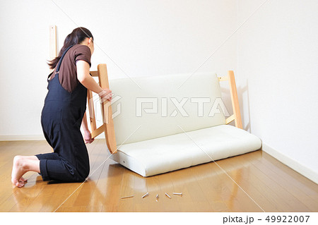 ソファを組み立てる女性