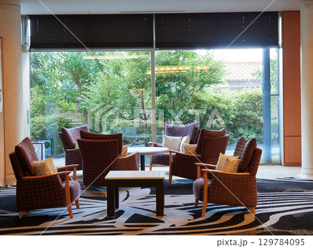 観光地のホテルのロビーの椅子とテーブルと和風庭の風景