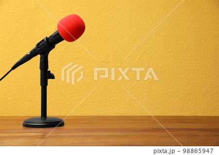 the microphone on the wooden table