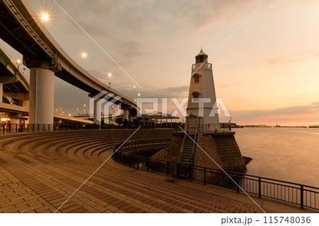 史跡 旧堺燈台と阪神高速 夕景 遅い時間帯