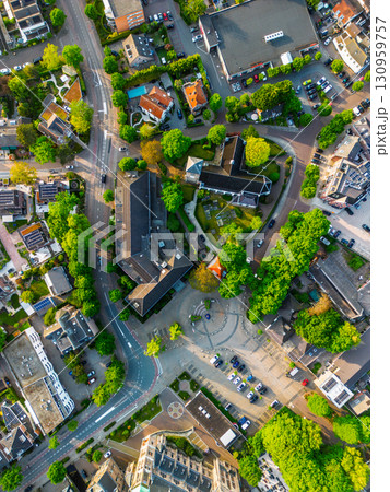 A European town with a tall green-spired church at its heart, surrounded by houses, shops, and tree-lined streets, blending historic charm with a modern urban layout.