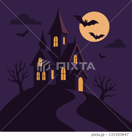 Haunted house, full moon, bats, dark sky, spooky trees, Halloween night, silhouette