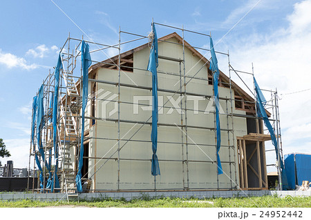 住宅 木造2階建て 建設現場 イメージ 足場 プラスターボード張り