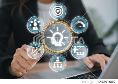 Business professional interacting with digital interface showcasing potential through various business icons and lightbulb symbol.
