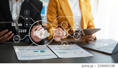 ESG Initiative Review. Two professionals analyzing sustainability strategies in a modern office.