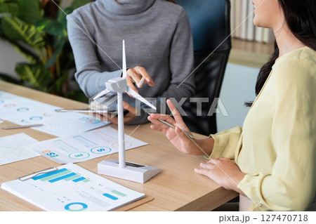 ESG Collaboration. Professionals Discussing Wind Energy Models and Sustainability Strategies.