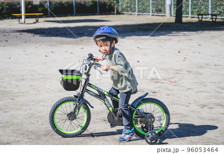 ヘルメットをかぶり補助輪付きの自転車に乗る子ども
