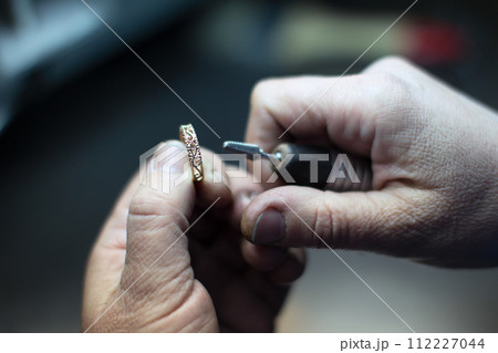 Industrial manufacture of the gold ring.Working hands make a gold decoration