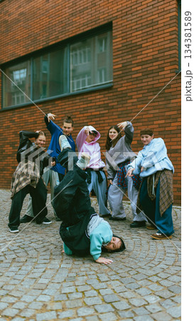 Breakdance performer executing floor move with group support.
