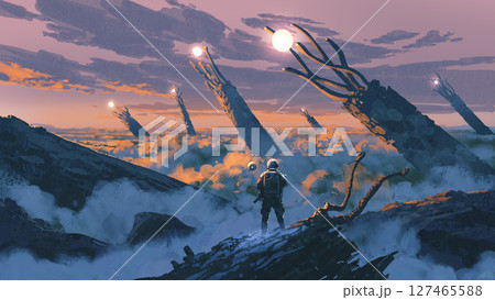 Astronaut Observes Giant Alien Structures Rising from Cloud-Covered Landscape at Sunset
