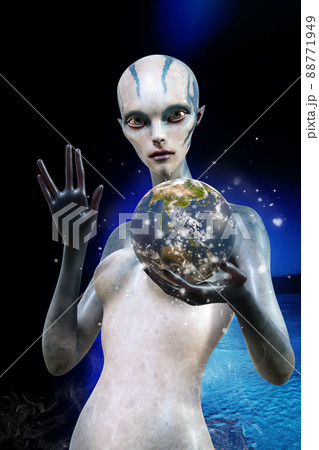 宇宙エイリアンが地球を片手に持ち、地球に光のエネルギーを送っている