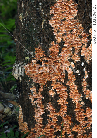 雑木林内にモミジウロコタケが大きく群生・重生する古木(アウトドアフィールド菌類マクロ撮影)