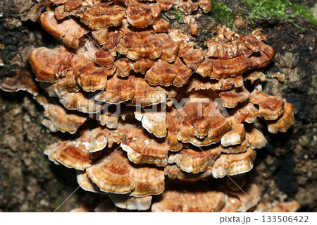赤茶色の貝殻が幾重にも重なったようなモミジウロコタケキノコ(アウトドアフィールド菌類マクロ撮影)