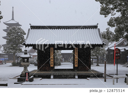 四国霊場第70番札所 仁王門から望む雪の「本山寺」境内(左から五重塔、本堂、大師堂、大門、右手前はお百度石)