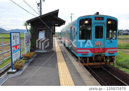 紫陽花の樽見鉄道日当(ひなた)駅に到着するハイモ