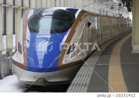 冬の糸魚川駅を発車する北陸新幹線W7系
