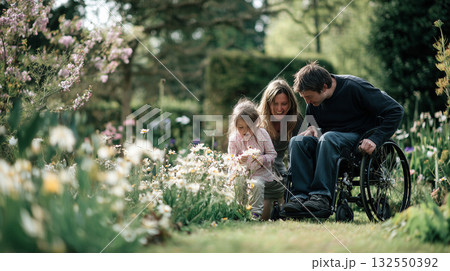 Family enjoying nature, father in wheelchair joining daughter picking flowers in a vibrant garden smiling