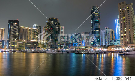 Dubai Marina towers and yacht in Dubai at night timelapse hyperlapse