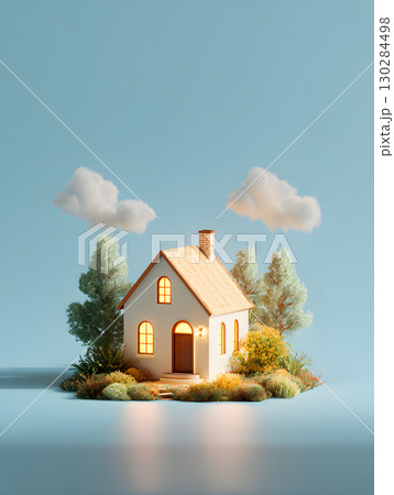 Yellow house against the background of growing graphics on a light background. Space for text.