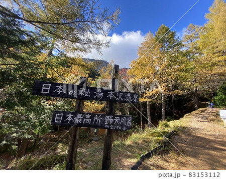 本沢温泉露天風呂と日本一高所の標識