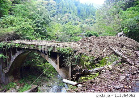 丹沢の本谷川に架かる旧瀬戸橋が土砂に埋まって廃墟になっていた