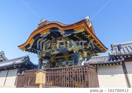 青空に映える美しい色彩の本願寺唐門(修復済)