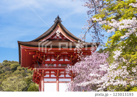 清水寺の桜の風景 京都の桜の名所 青空に映える仁王門 春の京都観光スポット