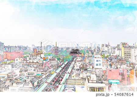 [水彩画風]浅草寺五重塔と宝蔵門(仁王門)